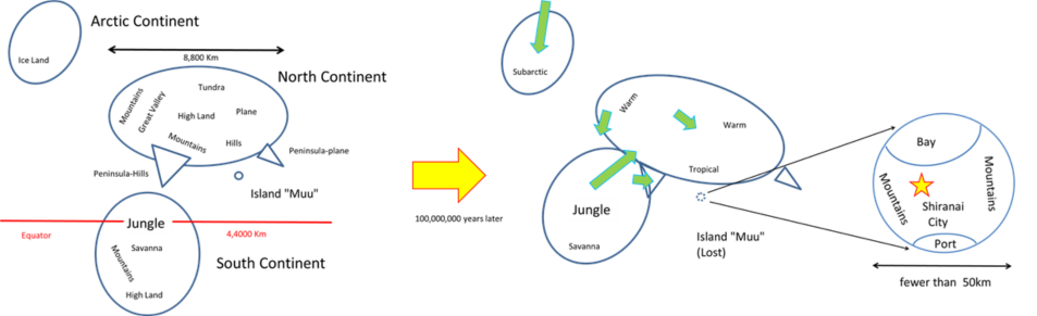 モアのユートピアは円形の島で、中央がくぼんだ三日月型をしている。私の惑星ムートピアは北と南の2つの大陸が舞台である。その間に2つの山地に挟まれたS字形の島があり、その島は『ムー(Muu[26])島』と呼ばれていたらしい。その入り江には古くからある街『シラナイ(Shiranai)市』が存在していた。ユートピアのアモーロート市に似ている。カレらの国際機関の本部があったとのことだ。『ムー[*2]』『シラナイ[*3]』と日本語で否定形に取れる意味にネーミングするのはモアのユートピアに倣っている。存在しないかもしれないので否定形でいい。しかしこのムー島は、北極大陸の南進による海水面の上昇で海中に没してしまい、今ではわずかに山並みを残すだけになっているという。失われた島だ。