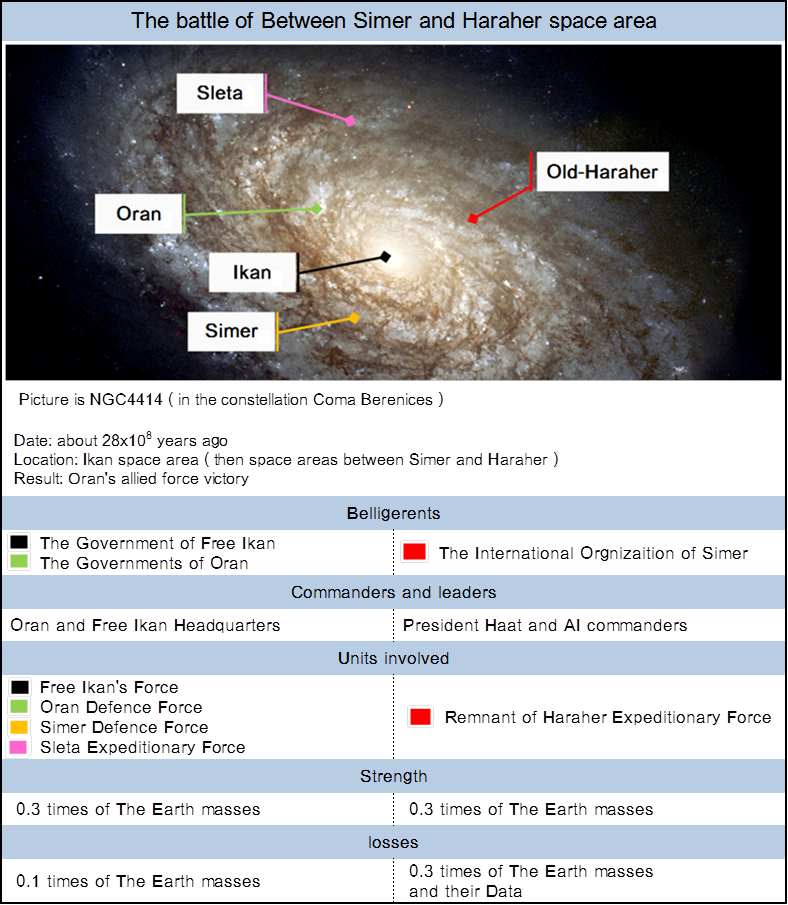 This battle had been done for beyond 10,000 years. First, Simer force revealed in front of the planet Ikan. But this was a reconnoiter, easily been repulsed. The planet Ikan had been organized the government of " Free Ikan ", and composited defensory forces. Then Simer force had attempted to make the shipbuilding bases between the Simer and the Haraher space area. These actions were anticipated by the Oran's Head quarters, they took the ambush for THEIR reveals. Also for the order of the return to the main planet, THEIR operations was a luck of leadership, and defeated one by one. Indeed the action that THEY had destroyed the hole Haraher's planets had caused a luck of ability of shipbuilding than Oran's and Ikan's. THEY were surrounded and destroyed completely.