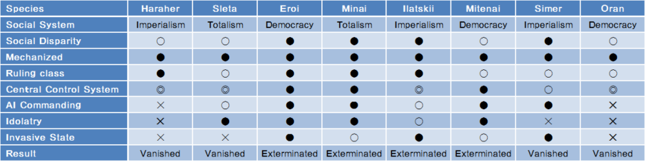 そこで機械化した種族がよく行っていることが、社会に『不完全性』を持たせるということだ。不完全なものは完全なものへのムーブメントを起こすので、それをもって社会に機械的な流動性を持たせようとする訳だが、具体的には社会に騒擾を起こすということに他ならないので、すぐに社会は堕落した。また社会変革のムーブメントによって社会が健全化されたのちには何が社会の流動性を保障していくのかというビジョンに乏しいため、いつまでも騒擾を起こし続けねばならないというジレンマに陥っていった。『悪者チーム』を作らざるを得ないということだ。