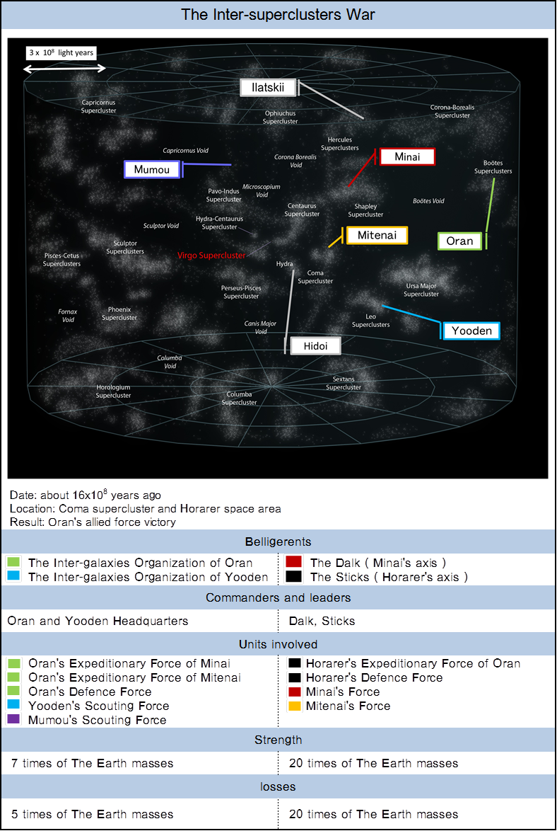 一方、内部の不満分子を排除したオラン人は、大体35億年前からこれらの地域への捜索を開始しだし、ミナイ・ミテナイの存在を把握していっていた。かみのけ座超銀河団のミテナイ人を討伐するための艦隊も派遣されたが、彼らはコマル人を人間の盾に取り、抵抗した。オラン人は何モノかの勧めに従っており、現地民を虐殺したりはしないと考えたからだ。だがミテナイ人地域へのオラン艦隊の進出はホラレル人勢力を刺激することになり、超銀河団間戦争の機運が一気に高まっていった。ホラレル人はオラン宙域に密かに艦隊を送り込み始めた。
