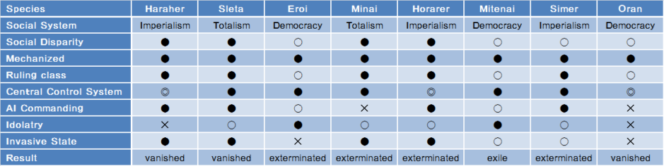 対立構造を放棄した場合はやがて全てが1つになり、内部では闘争が起こらなくなるが、それが外部の異種族と接触した場合に様々な問題を惹起して新たな闘争の火種となっているようだ。端からみておかしな価値観を押し付けてくる種族もいる。すべてが『母親』とか呼ばれるAIコマンダーの指示の下に動き、人間が自由意思で生きることを否定される社会だ。日本風にいうと『一人勘定[*20]』で全てが動く社会だ。カレらの弁では