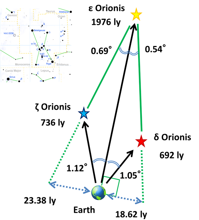 If let 兟-Orionis be 692 light year away, 兠-Orionis be 1976 light year away, 兡-Orionis be 736 light year away (from SIMBAD Astronomical Database browsed in 2013), it considered that THEY might live in within about 40-light-year-width square.