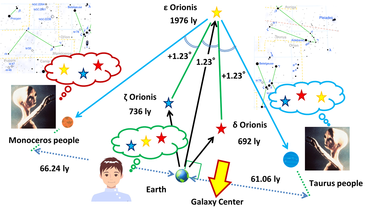 If considered that THEY might see the different location of the tri-star, the lines that THEY can see a true tri-star are spread about 60 light year away, and the range is changedwithin 692 light year around (but this may be little irregular). If Monocerus people or Taurus people might exist, THEY might live in 66 light year away (Aldebaran), or 150 lightyear away (Hyades cluster), but not β-Monocerotris (700 light year away).